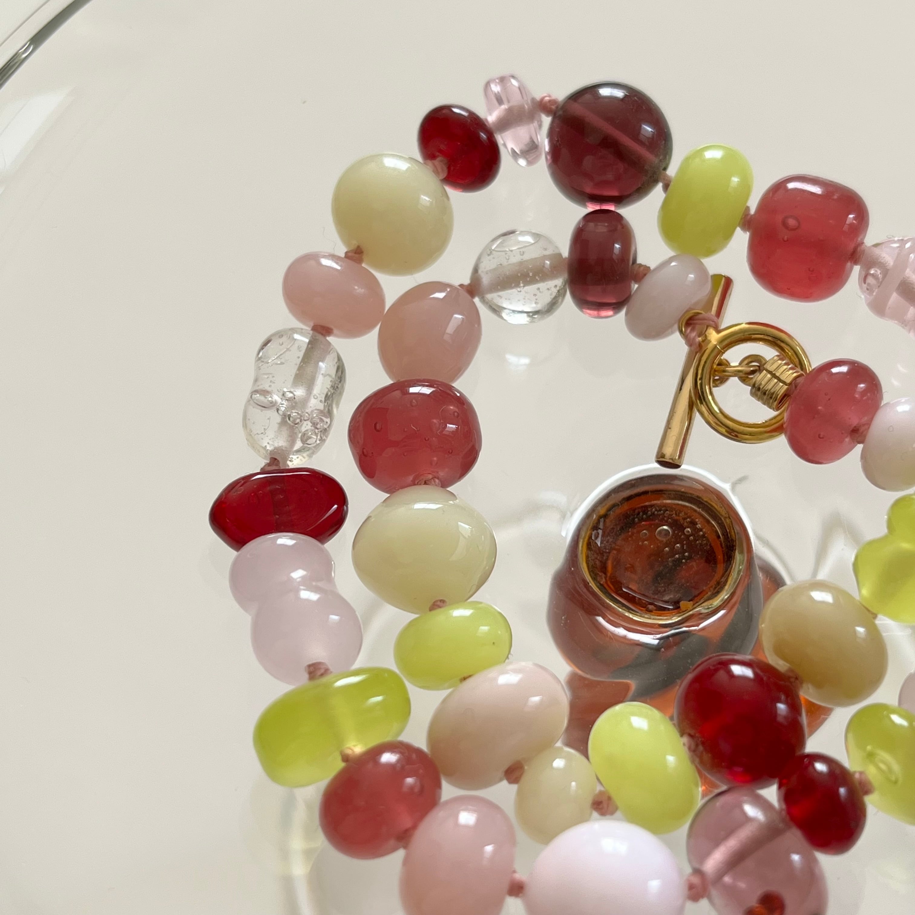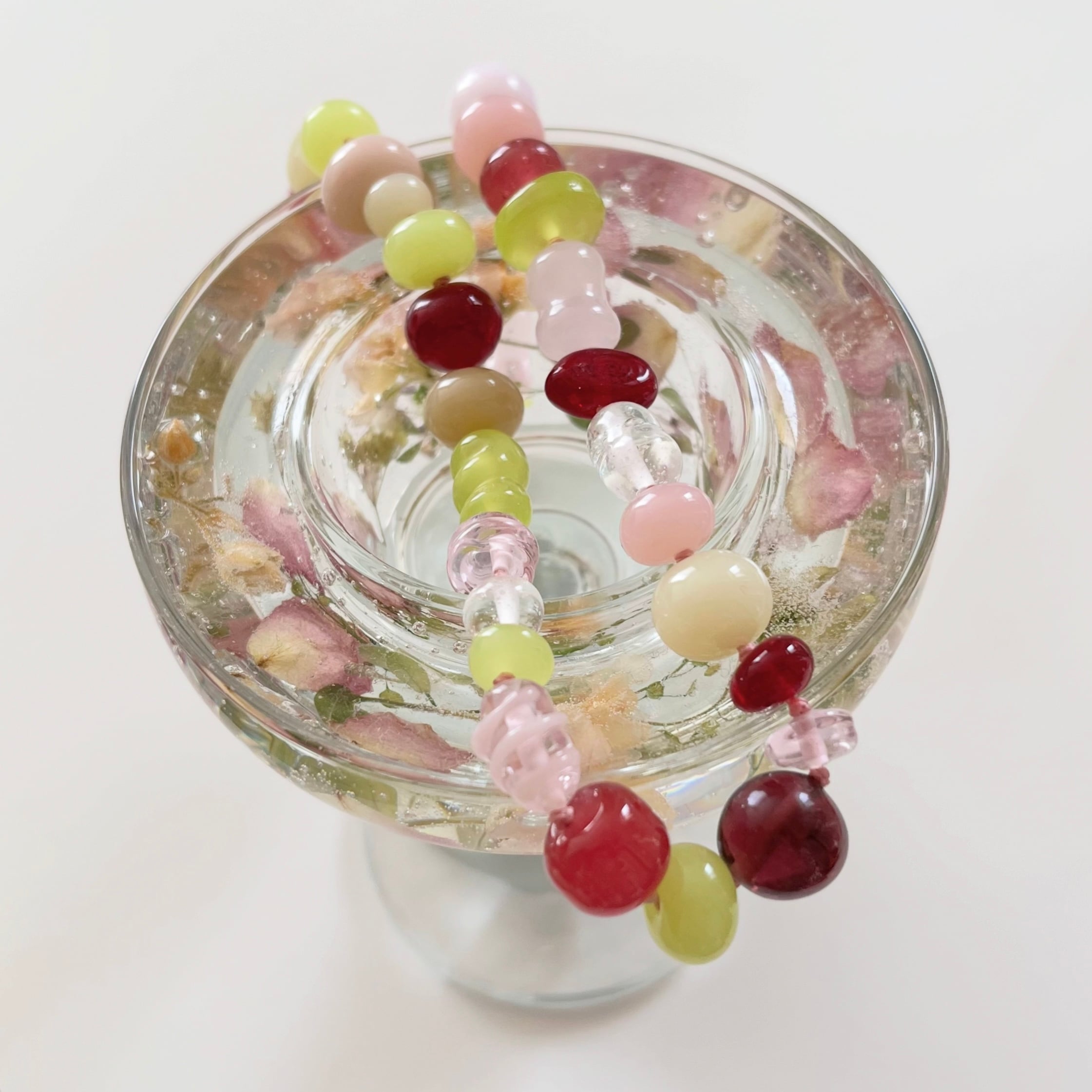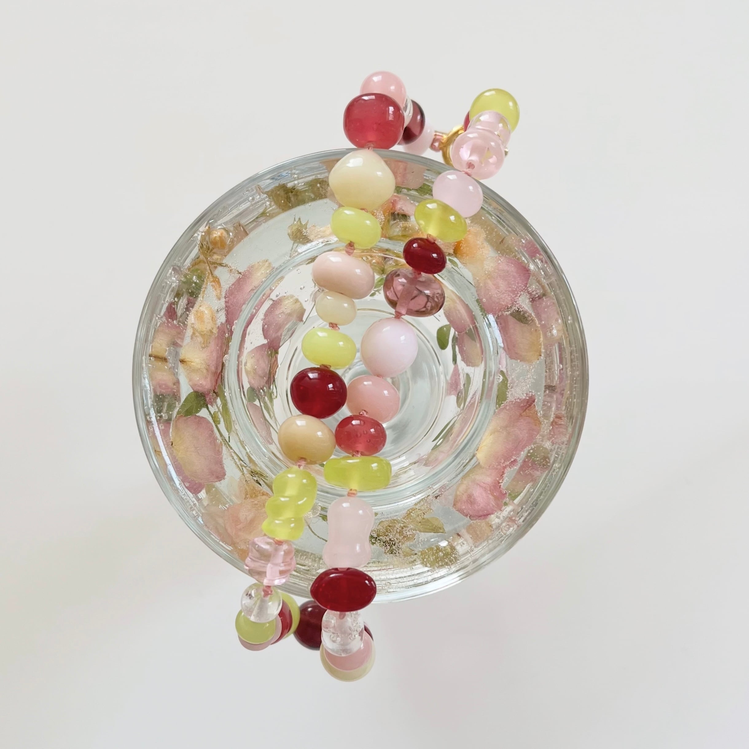 花びらがふわりと舞う瞬間を、そのまま閉じ込めたようなガラスビーズネックレス。