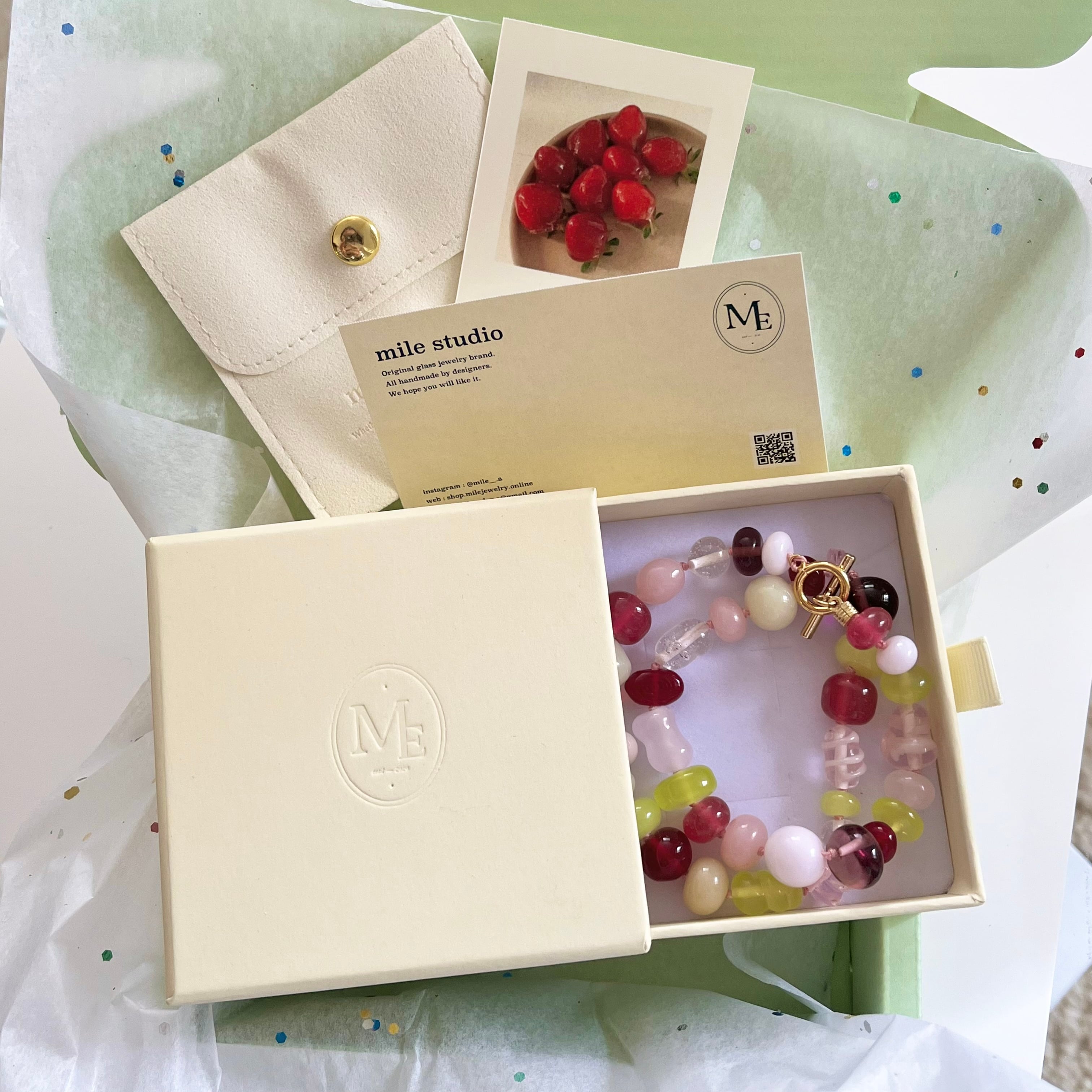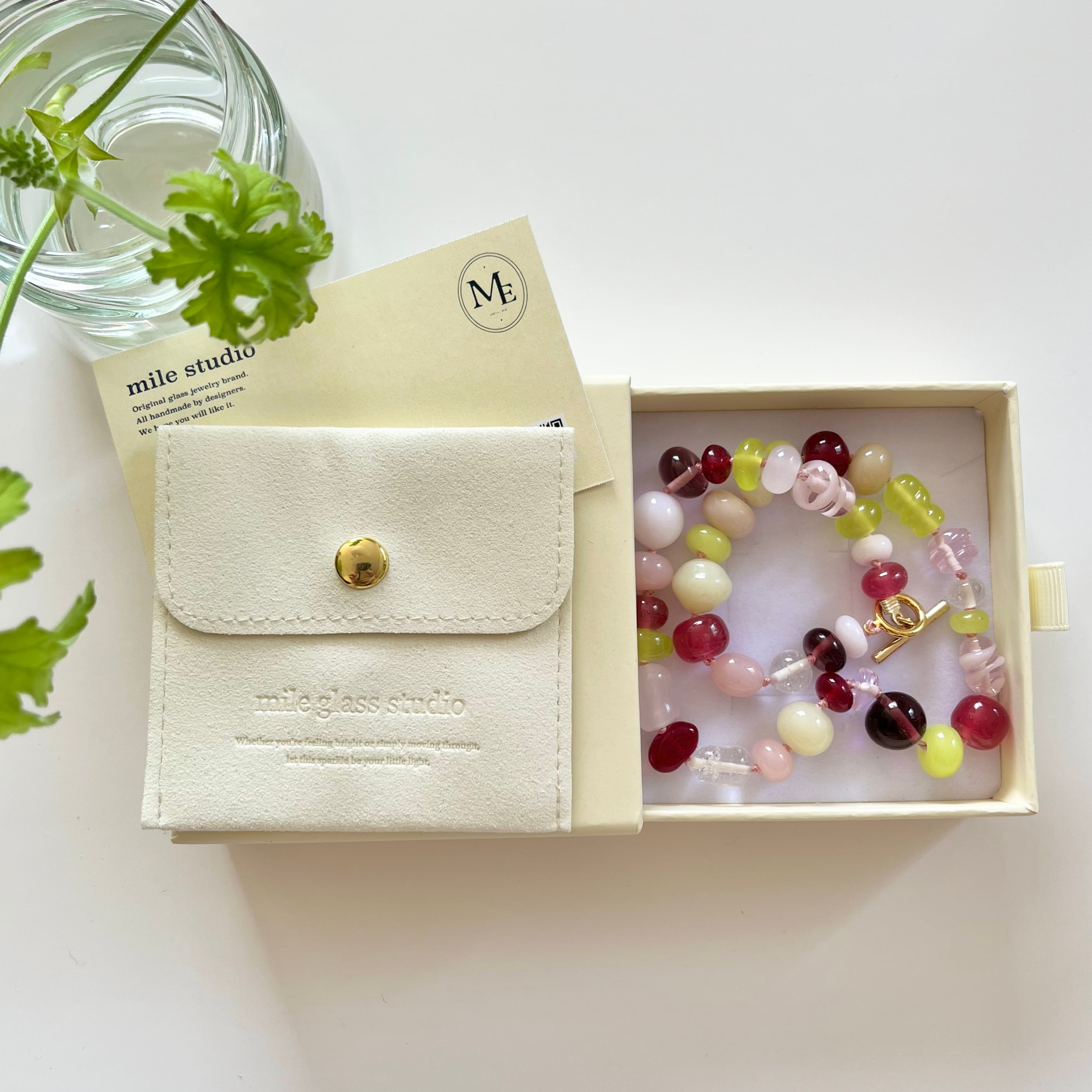 淡い色合いのビーズを丁寧に組み合わせ、春の光にきらめく“やわらかな透明感”を表現しました。